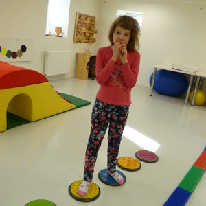 - Pokračujeme až na konec hmatového chodníku, kde dívku necháme odpočinout, můžeme jí dopřát jemnou masáž nohy (pohlazení, promnutí) a oblékneme jí ponožky.