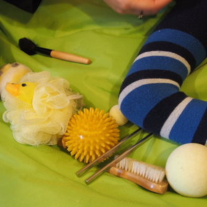 - Hmatové: různě strukturované žínky, molitanové míčky (menší a větší), štětec (vhodný je kulatý kosmetický), nahřátý nebo nachlazený gelový sáček apod.